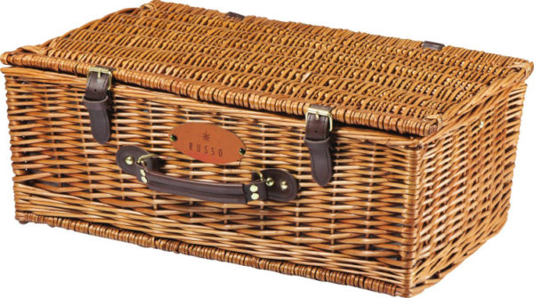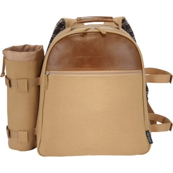 Zip open access to large insulated storage compartment, padded adjustable backpack straps, insulated wine bottle holder, 47″” x 52″” blanket with plastic backing and hook and loop closure, padded carry handle, padded back, 2 each (plastic wine glasses, plastic plates, forks, knives, spoons, fabric napkins), corkscrew/bottle opener, cutting board, salt and pepper shakers, 1200D construction. 16″” W x 12″” H x 14″” D